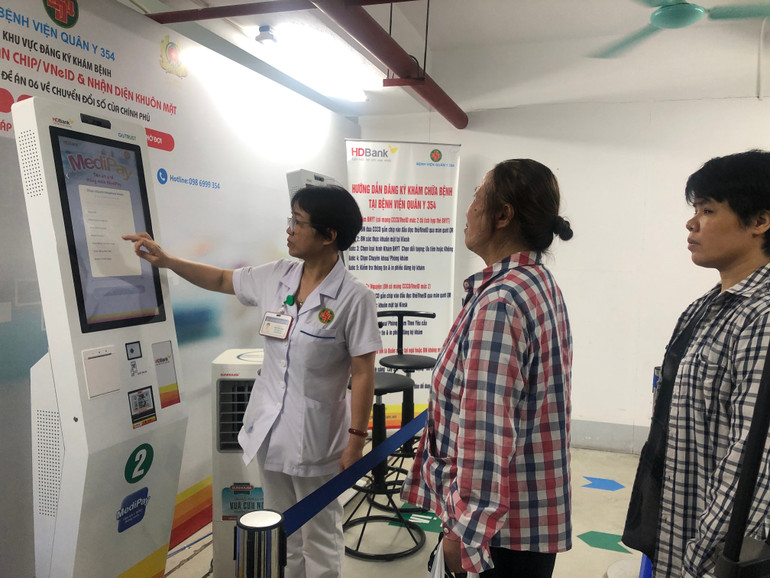Hơn 8 giờ sáng, tại Khoa Khám bệnh, Bệnh viện Quân y 354 (Hà Nội) đã rất đông bệnh nhân. Tuy vậy, cảnh xếp hàng dài, kê khai giấy tờ như trước đây đã không còn. Nhiều người chủ động đăng ký khám ban đầu qua kiosk tự phục vụ đặt tại sảnh lớn. Một số bệnh nhân cao tuổi được nhân viên y tế hỗ trợ thao tác trên máy.
